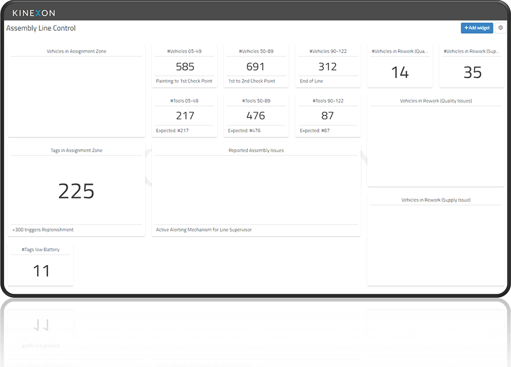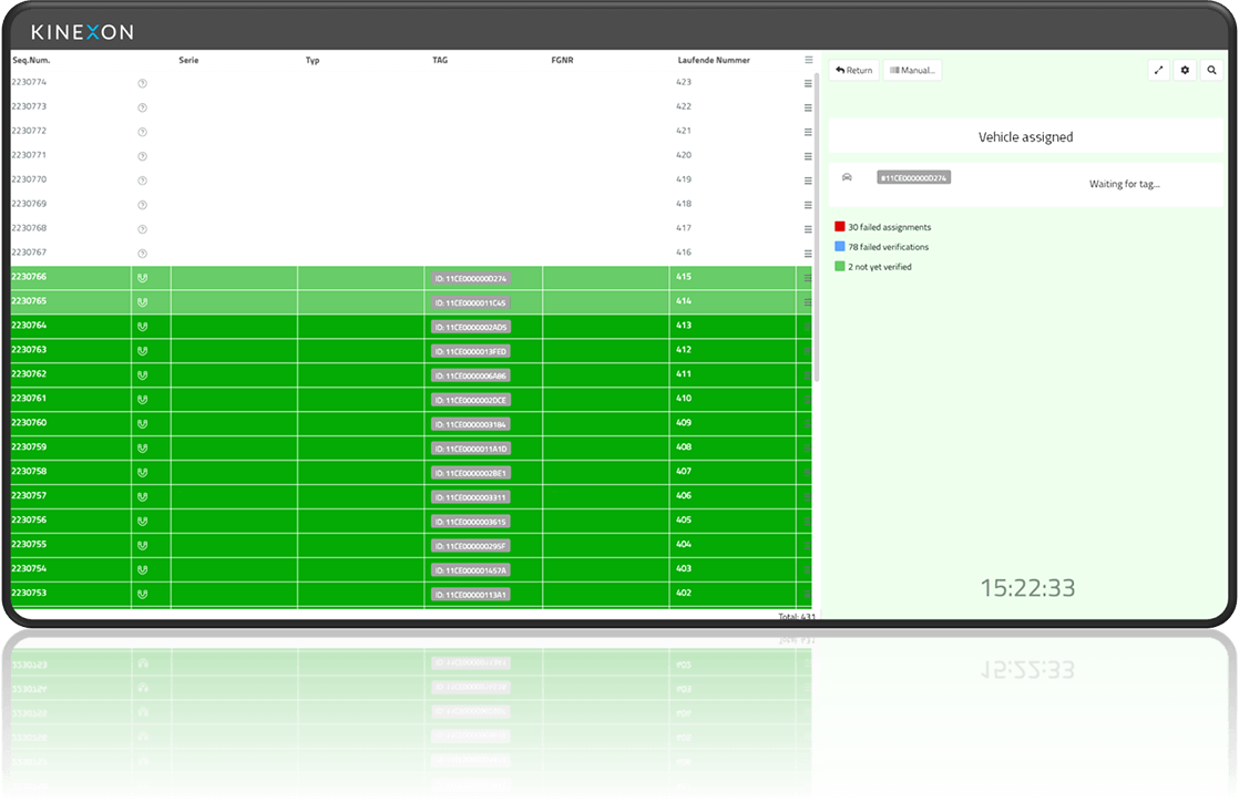 Within dedicated assignment zones, each vehicle on the assembly line is equipped with a KINEXON e-Paper tag to precisely trace its position. Pre-configured assembly areas can cover one or more assembly sequences to determine which vehicle variant requires certain assembly operations.